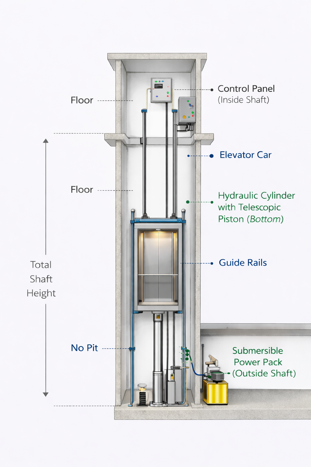 A hydraulic pitless lift is a type of elevator that operates using a hydraulic system (oil pressure and piston) but does not require a deep pit at the bottom of the shaft.