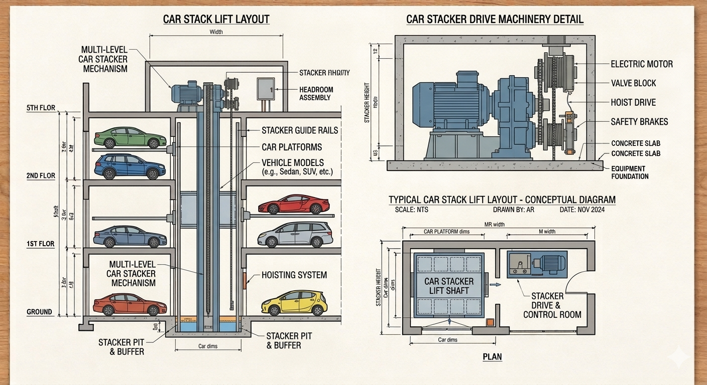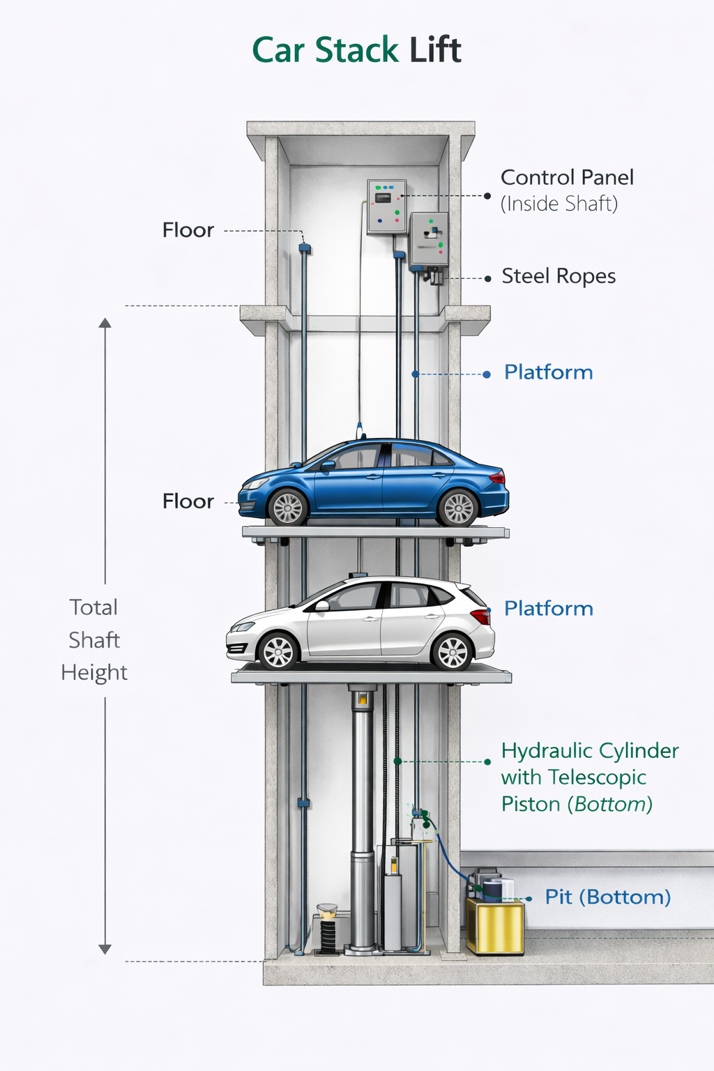 A car stack lift is a parking solution that increases capacity by stacking vehicles vertically. It uses a hydraulic or mechanical lifting system to raise one vehicle so another vehicle can be parked underneath it.